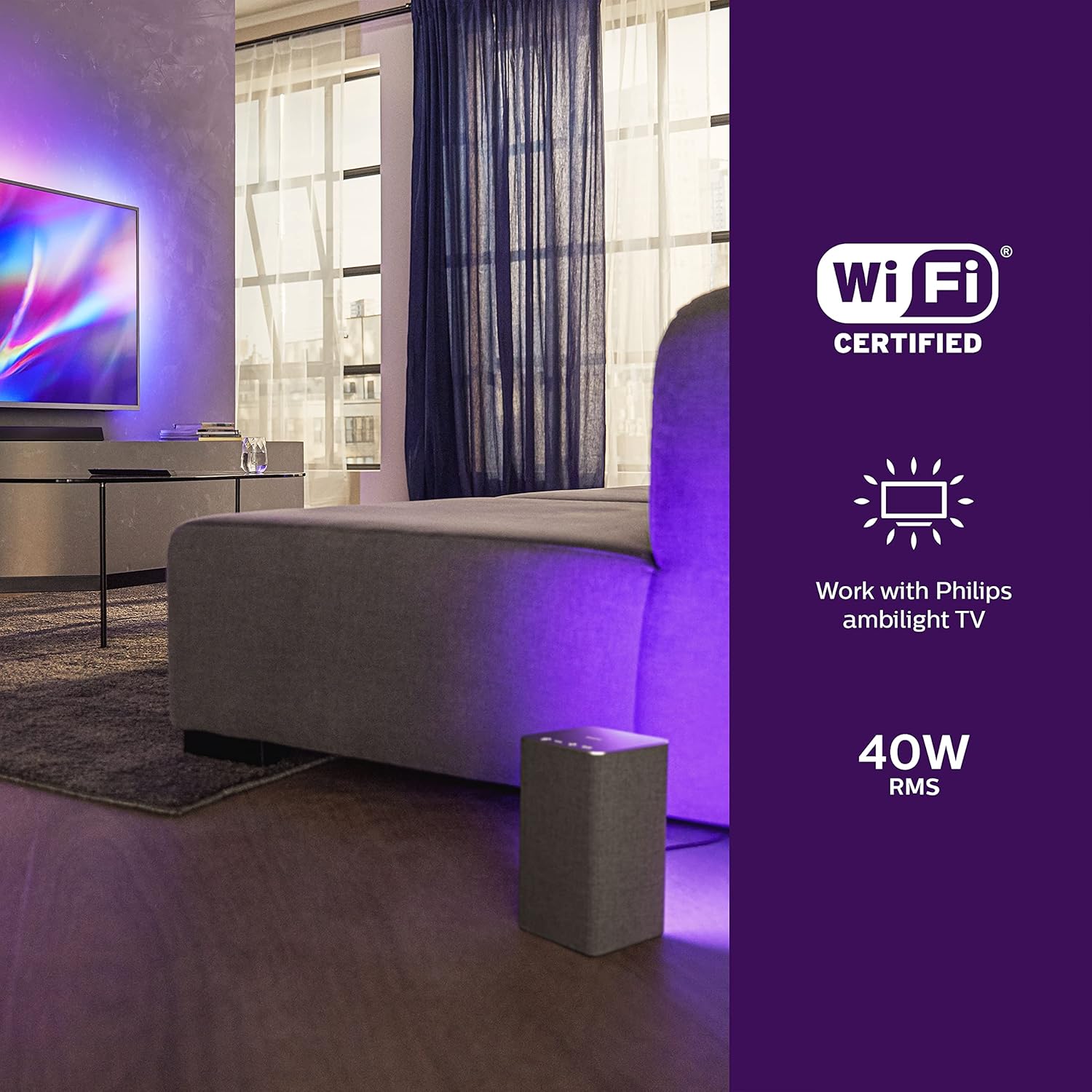 (40 W, DTS Play-Fi ile uyumlu, ses asistanlarıyla bağlantı, entegre LED, Ambilight, stereo ses)