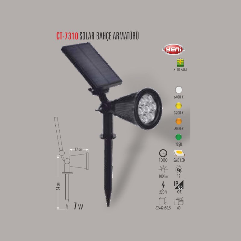 Cata 6400K Beyaz Işık Solar Bahçe Ledli Armatürü Şarjlı CT-7310