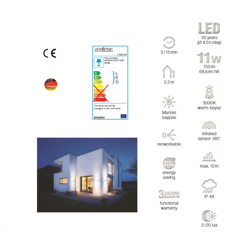Aynı teknoloji, hatta daha da etkili: Eğer evinizin dışında biraz daha fazla ortam ışığı arıyorsanız, size L 910 LED’li yukarı/aşağı ışık çözümünü önerebiliriz, hem şık hem de etkili. Küçük kardeşinde olduğu gibi bunda da bakım gerektirmeyen ve düşük tüketimli LED’ler size estetik bir ortam aydınlatması sağlıyor ve güvenilir IR sensörü ile istediğiniz yerde kullanma olanağı veriyor. Ve eğer bunları birbirine bağlarsanız, eş zamanlı olarak açıp kapatma olanağınız da oluyor. Bu sadece estetik stil hayranları tarafından takdir edilen bir özellik değil.
