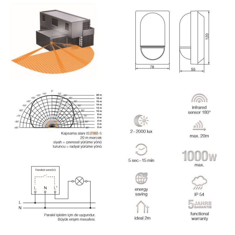 Mimari standartlara bağlı olarak binaların önünde yer alan büyük giriş alanlarında, gece gelen ziyaretçilere veya geçenlere yolu etkin hale getiren otomatik ışık sistemleri büyük yarar sağlar. Burada ayrıca tasarım da büyük rol oynar. IS 2180-5, duvarda çepeçevre güzel bir görünüm sunar. Ve birçok yenilikçi ayar olanağını da beraberinde getirir. Böylece örneğin algılama açısı ve menzil, ilgili kullanım yerine esnek biçimde uyarlanabilir.